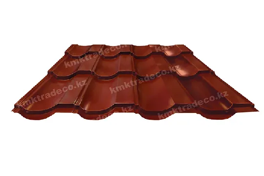 Металлическая кровля имеет максимальное сходство с натуральной черепицей. Листы изготовлены из тонколистовой стали толщиной 0.40 мм с МАТТ (матовым) покрытием премиум-класса – придаёт поверхности кровли необычный матовый «бархатистый» вид. Цвет – RAL 8004 Медно-коричневый. Высота профиля – 25+/-1 мм.